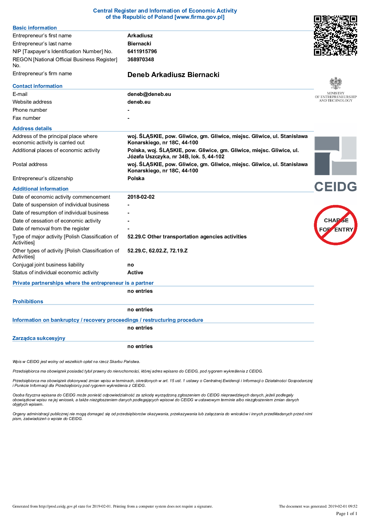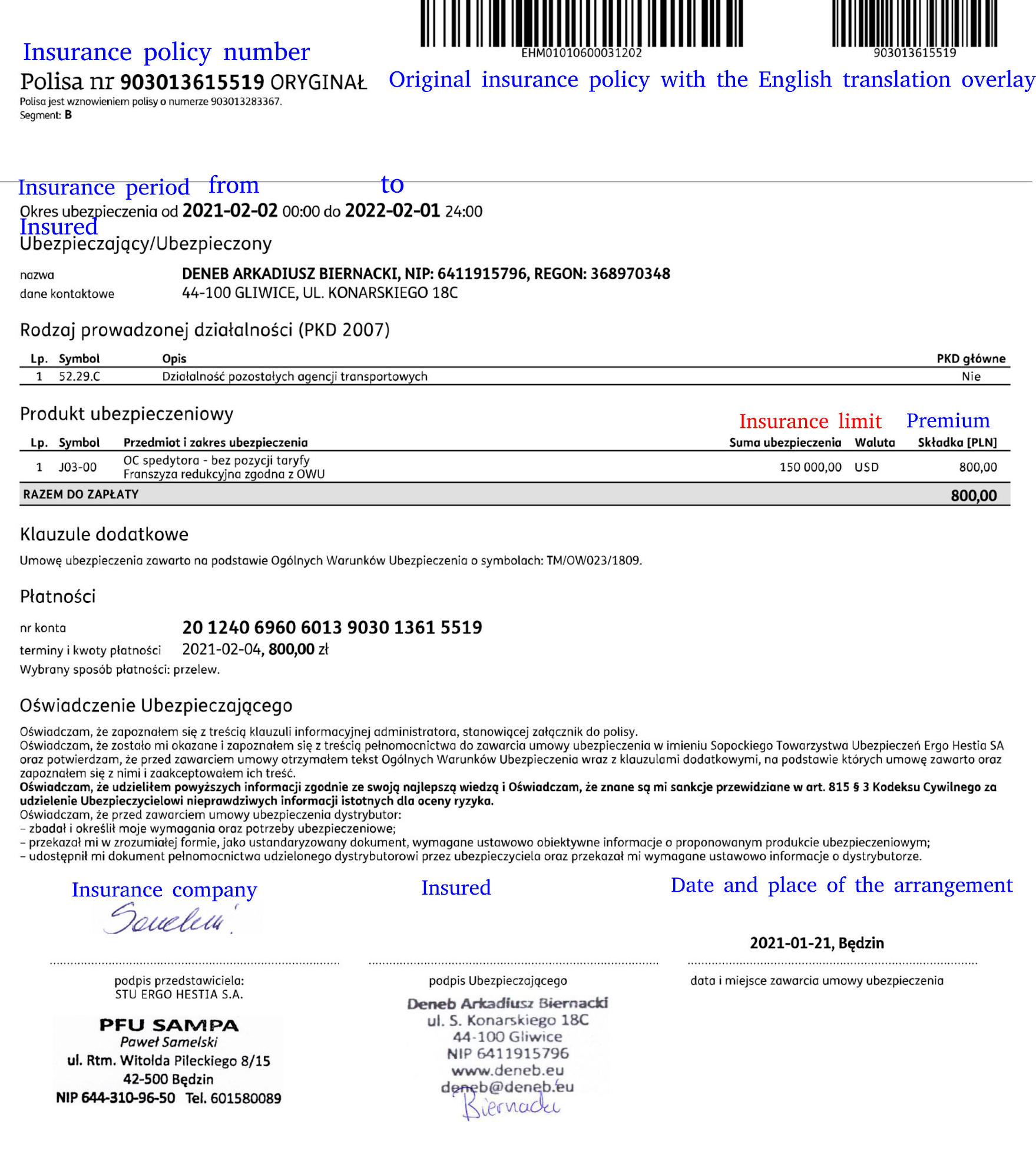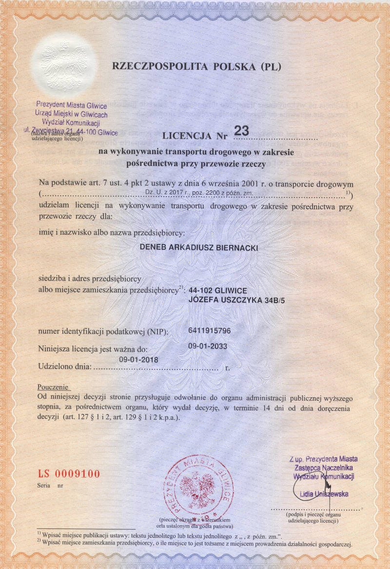 Documents Insurance policy of a freight broker (PL), valid since 2021-02-02 till 2022-02-01 Licence of a freight broker (PL) Registration in the CEIDG (Central Registration and Information on Economic Activity) database